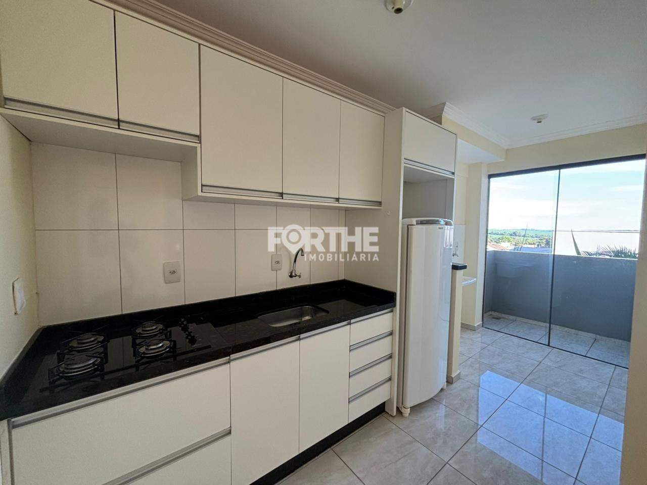 • Cozinha com armários, cooktop e geladeira;
